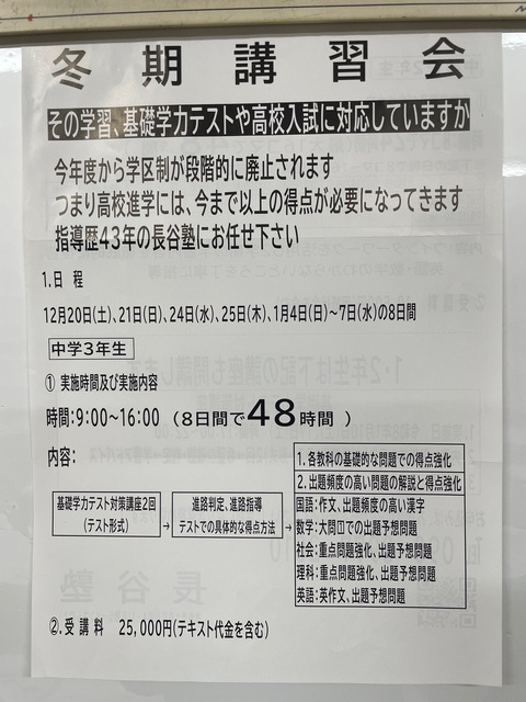 併せて、1月10日、17日と基礎学力テスト対策講座を実施します。現在の学力、今後どんな学習をすればいいのかのアドバイスもします。